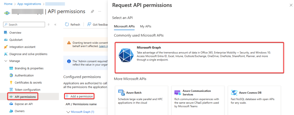 - Uygulamanızın ayarlarında API İzinleri’ne gidin (Yönet -> Sertifikalar ve sırlar) .
